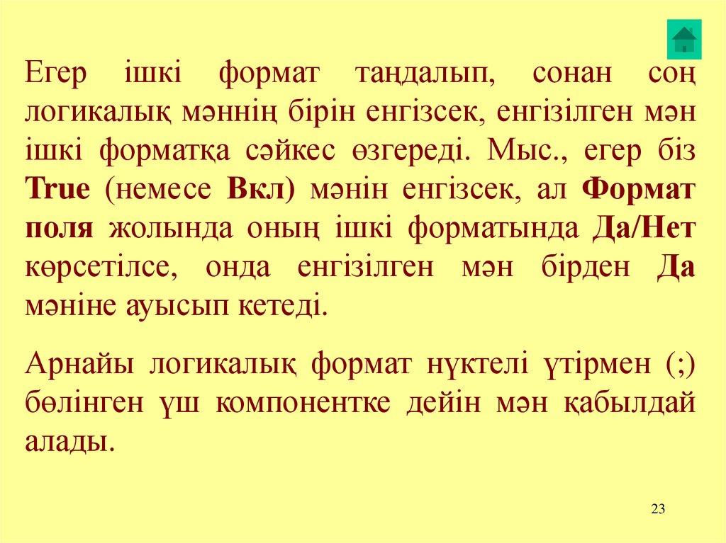 Егер ішкі формат таңдалып, сонан соңлогикалық мәннің бірін енгізсек, енгізілген мән