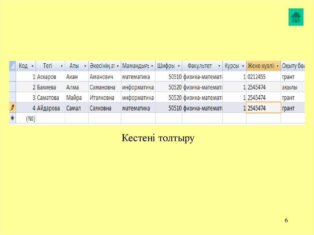 Кестенің әрбір жолы жазба (запись - record)деп аталады. Жолдар рет-ретімен нөмірленіп