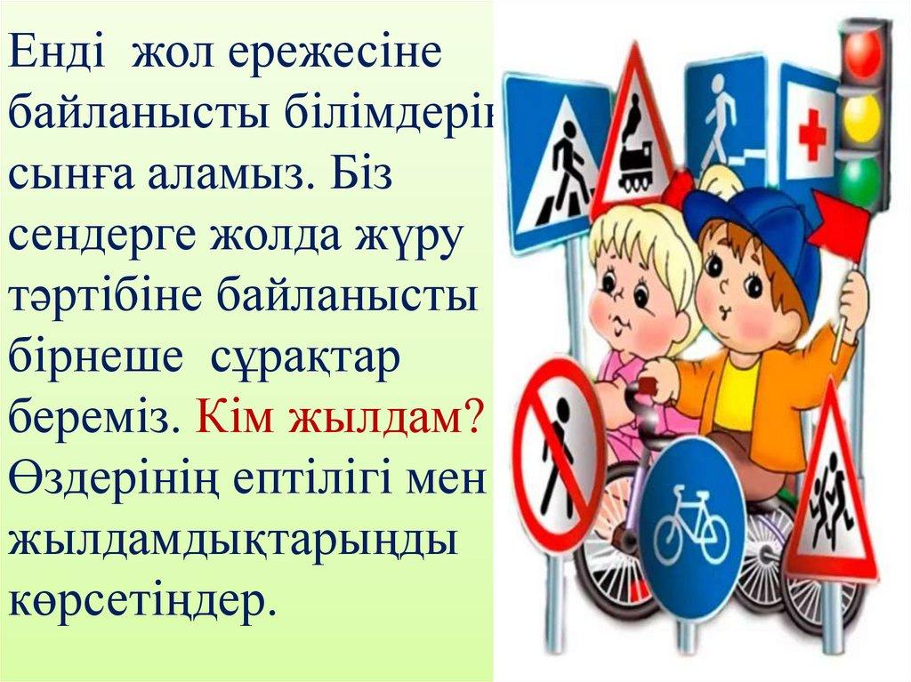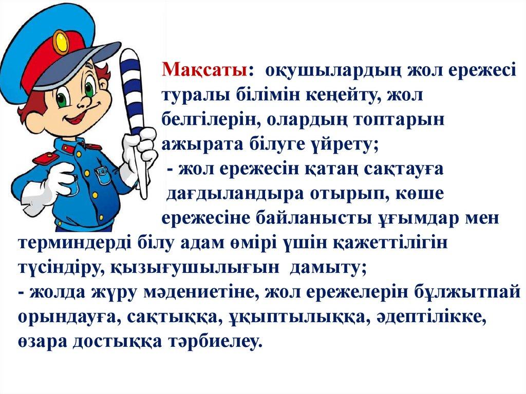 Мақсаты: оқушылардың жол ережесітуралы білімін кеңейту, жол