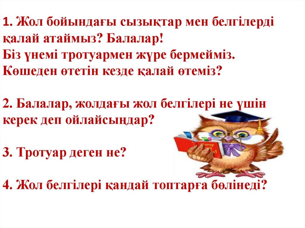 1. Жол бойындағы сызықтар мен белгілердіқалай атаймыз? Балалар!