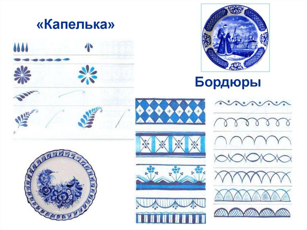 Основные элементы гжельской росписи «широкая и узкая полоса», «точка»,«волна», «кустик», «лепесток», «сетка»,