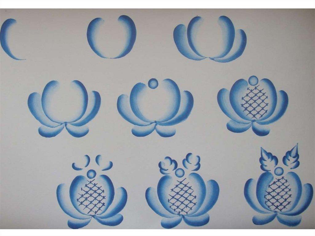11. Основные элементы гжельской росписи - «широкая и узкая полоса», «точка», «волна», «кустик», «лепесток», «сетка», «листок».