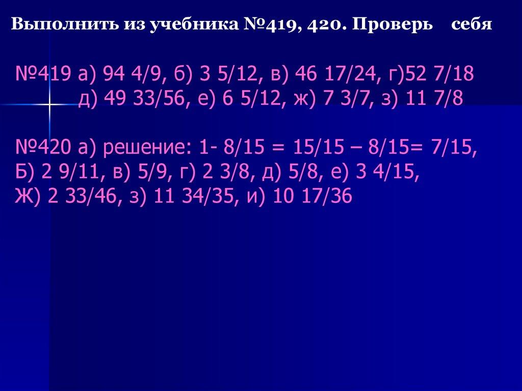 №419 а) 94 4/9, б) 3 5/12, в) 46 17/24, г)52 7/18