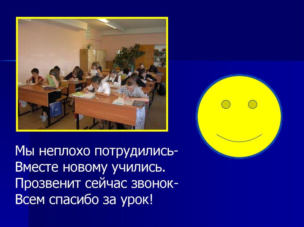Мы неплохо потрудилисьВместе новому учились.Прозвенит сейчас звонокВсем спасибо за урок!