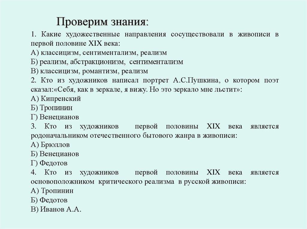 Проверим знания:1. Какие художественные направления сосуществовали в живописи в