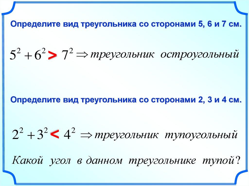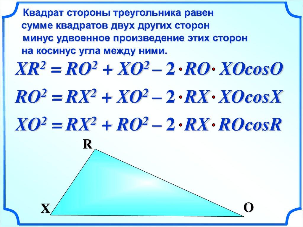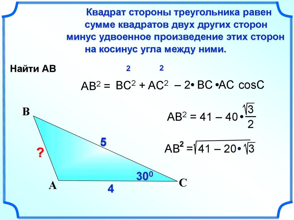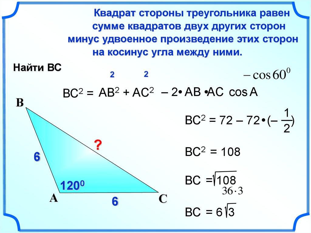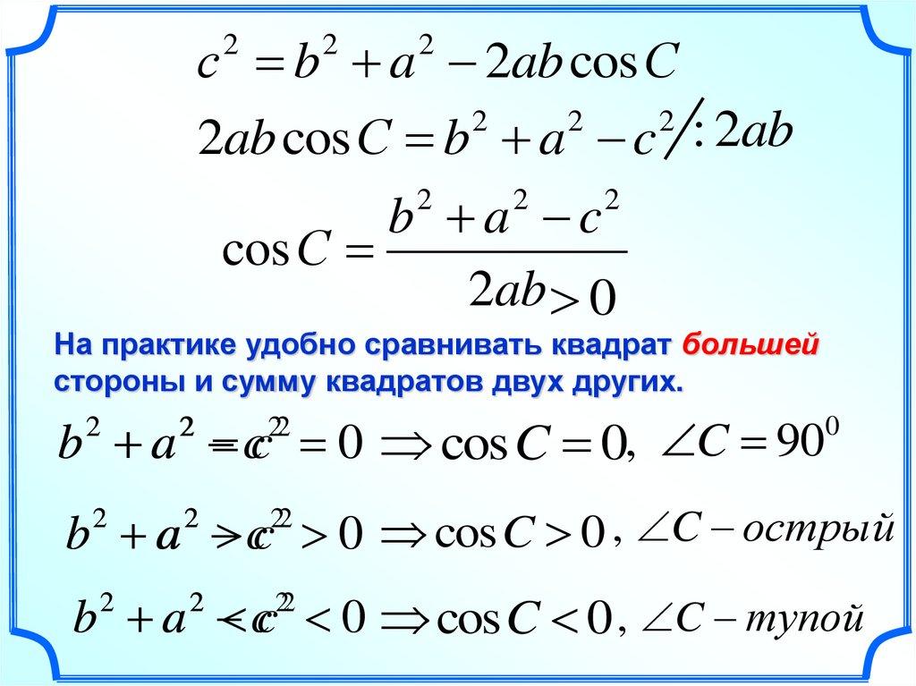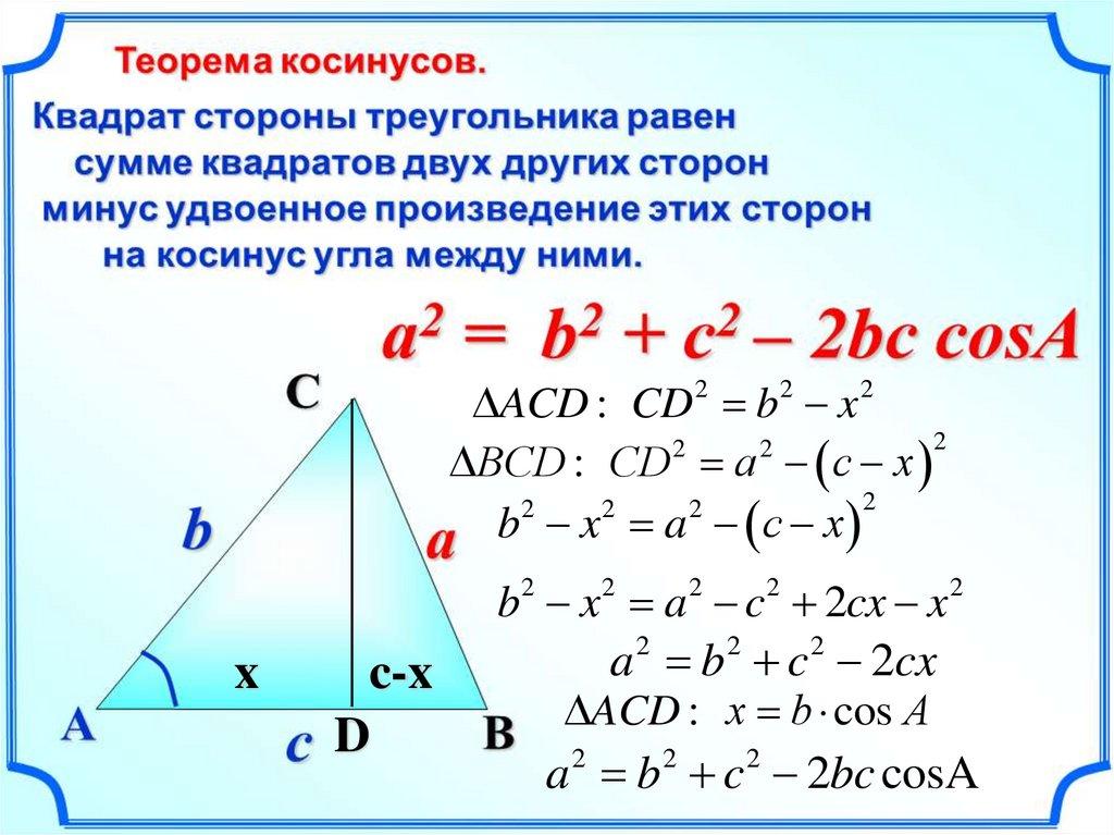 Теорема косинусов.Квадрат стороны треугольника равен сумме квадратов