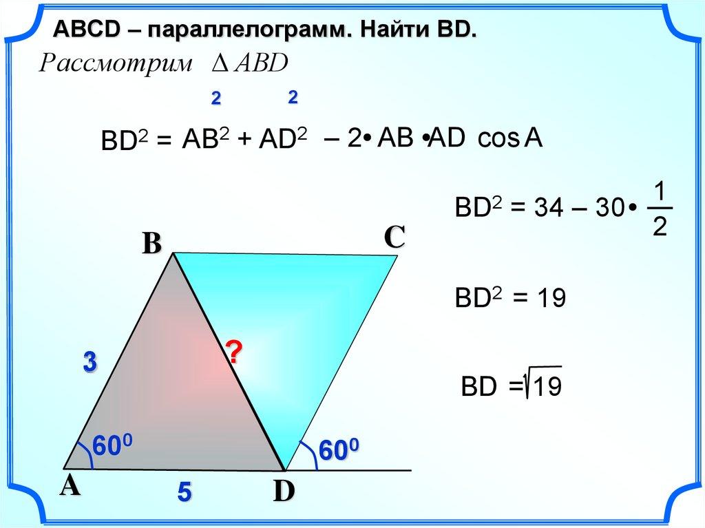 ABСD – параллелограмм. Найти ВD.Рассмотрим АВD
