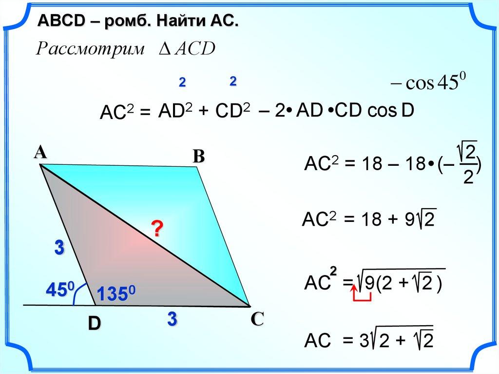 ABСD – ромб. Найти AC.Рассмотрим АСD