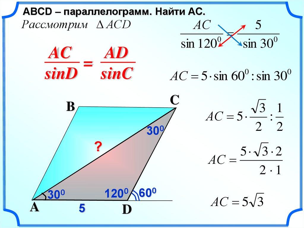 ABСD – параллелограмм. Найти AC.Рассмотрим АCD