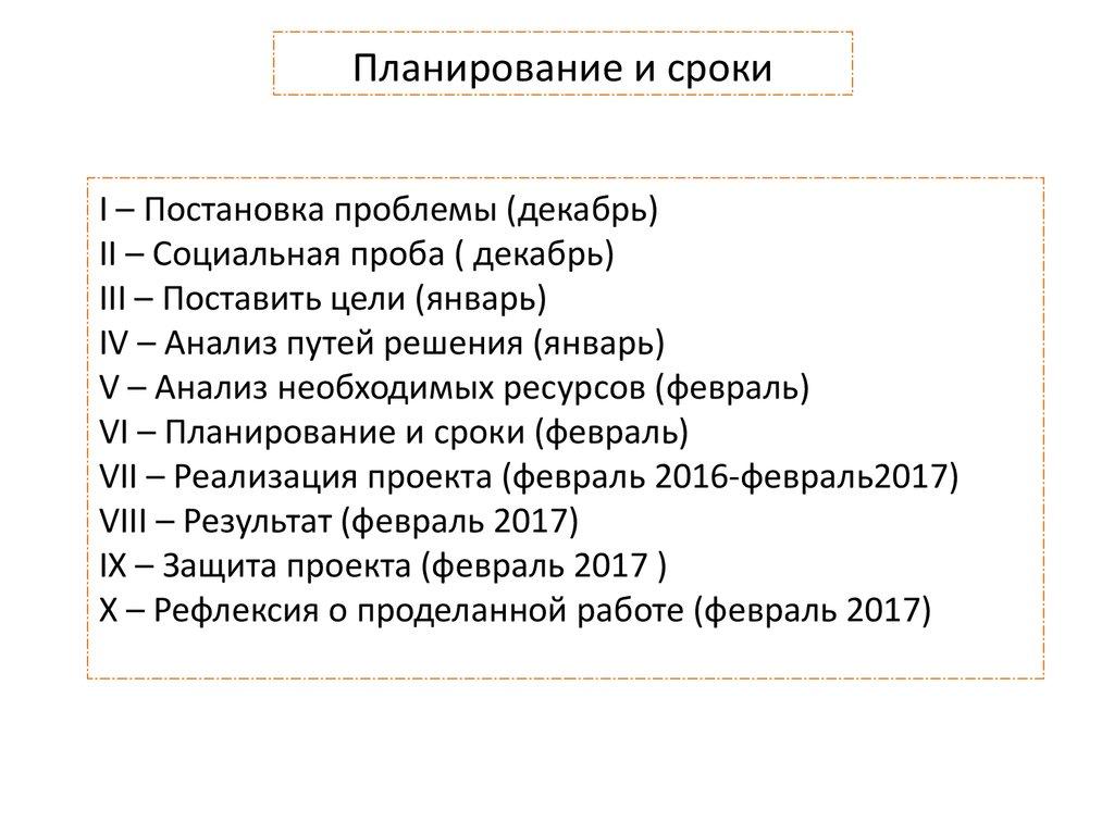 Планирование и срокиI – Постановка проблемы (декабрь)