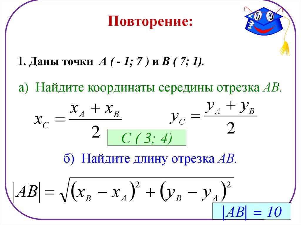 Повторение:1. Даны точки А ( - 1; 7 ) и В ( 7; 1).