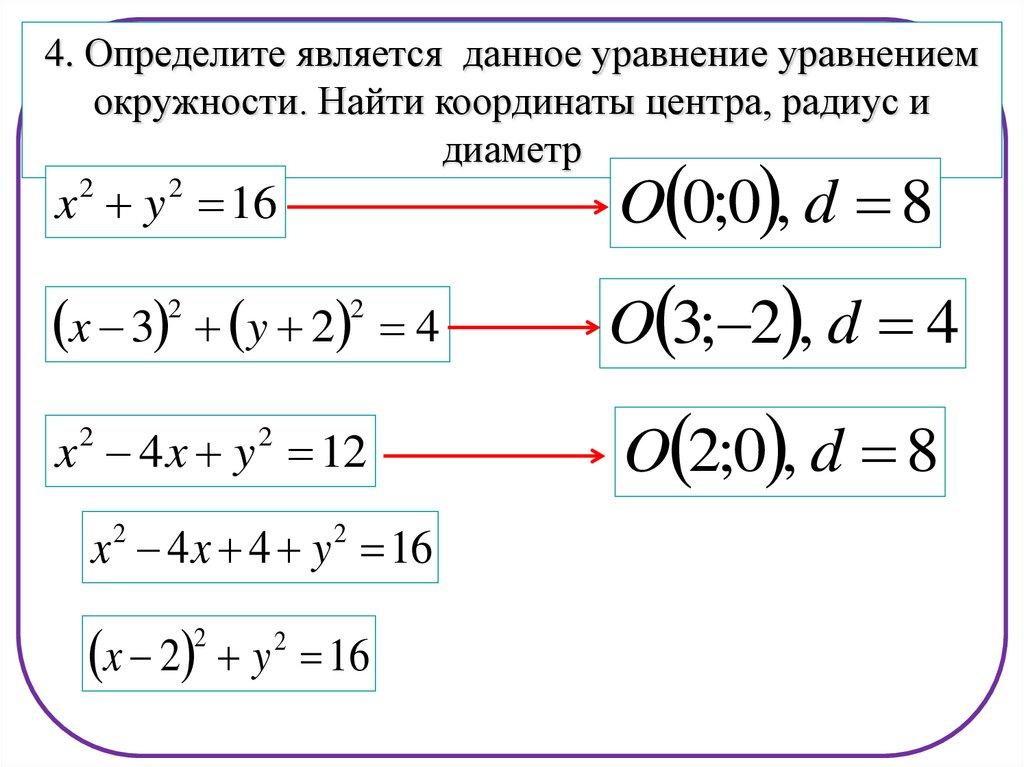 4. Определите является данное уравнение уравнениемокружности. Найти координаты центра, радиус и
