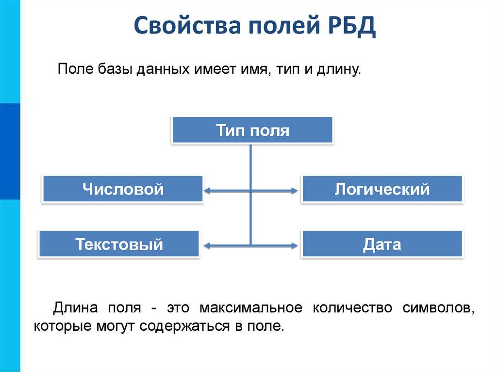 Свойства полей РБДПоле базы данных имеет имя, тип и длину.