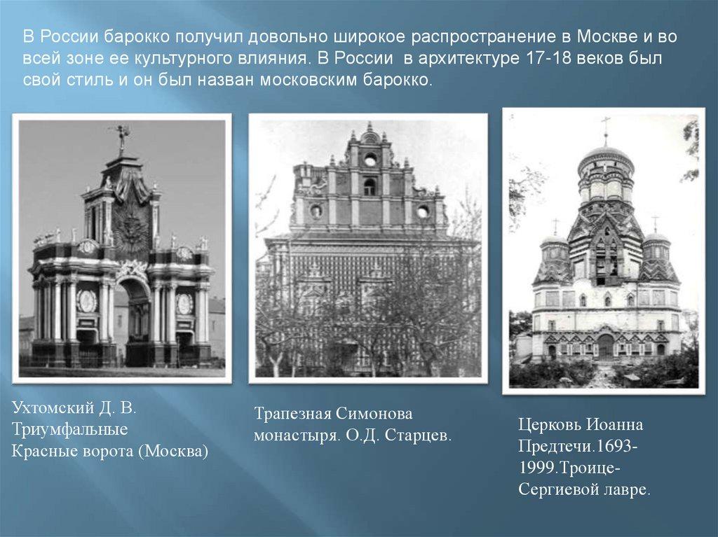 В России барокко получил довольно широкое распространение в Москве и вовсей зоне ее культурного влияния. В России в архитектуре 17-18 веков был