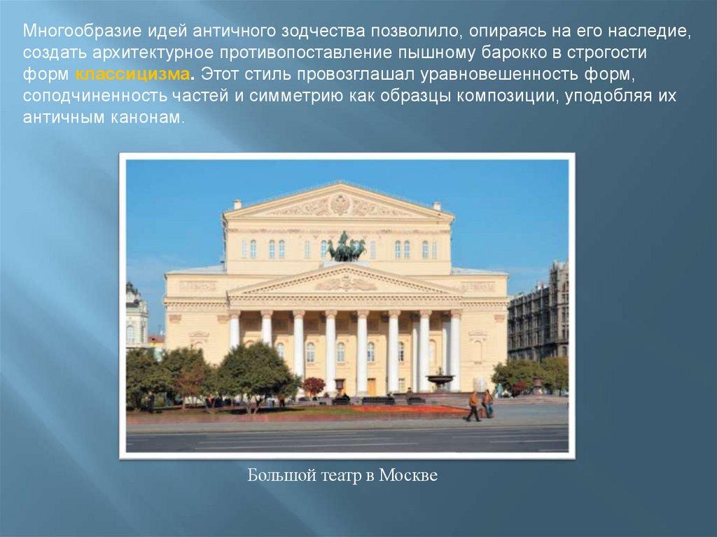 Многообразие идей античного зодчества позволило, опираясь на его наследие,создать архитектурное противопоставление пышному барокко в строгости