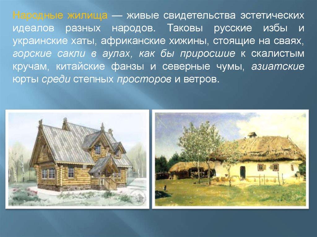Народные жилища — живые свидетельства эстетическихидеалов разных народов. Таковы русские избы и