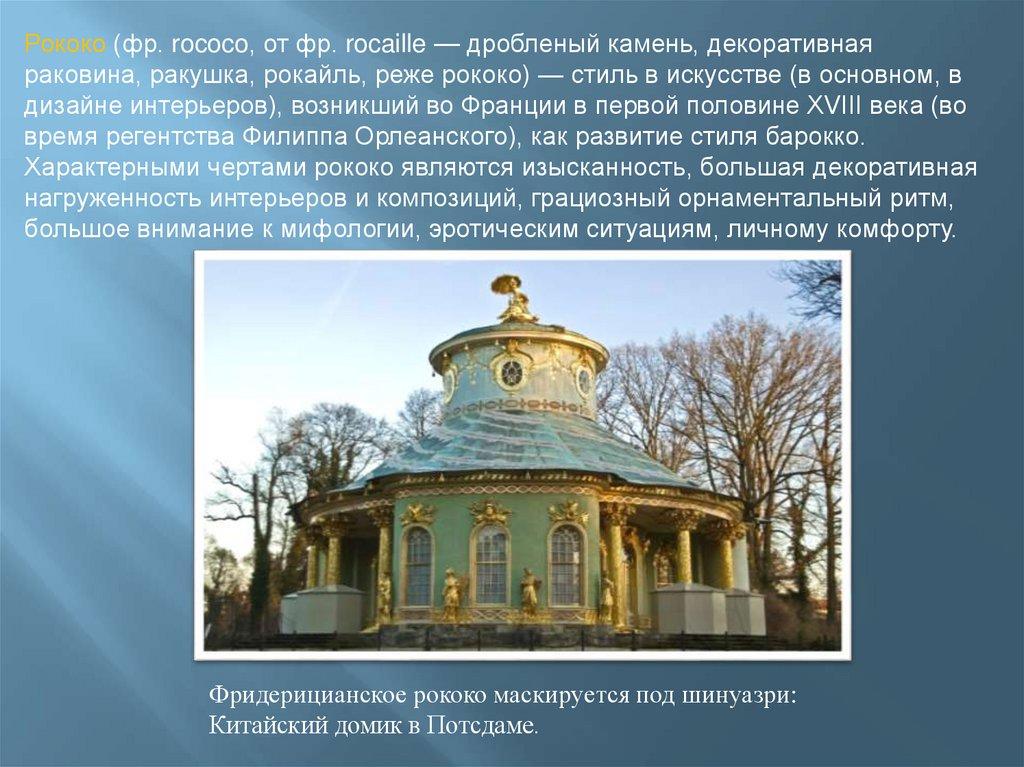 Рококо )фр. rococo, от фр. rocaille — дробленый камень, декоративнаяраковина, ракушка, рокайль, реже рококо) — стиль в искусстве )в основном, в