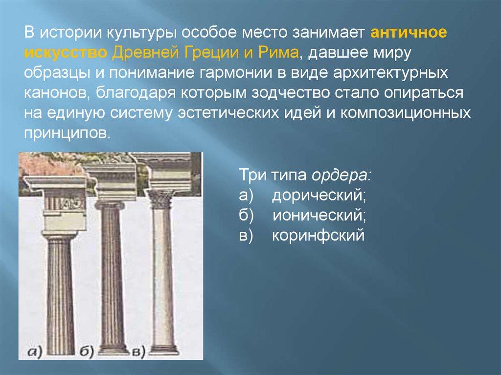 В истории культуры особое место занимает античноеискусство Древней Греции и Рима, давшее миру