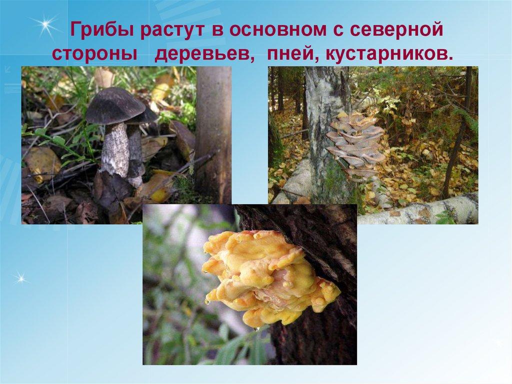 Грибы растут в основном с севернойстороны деревьев, пней, кустарников.