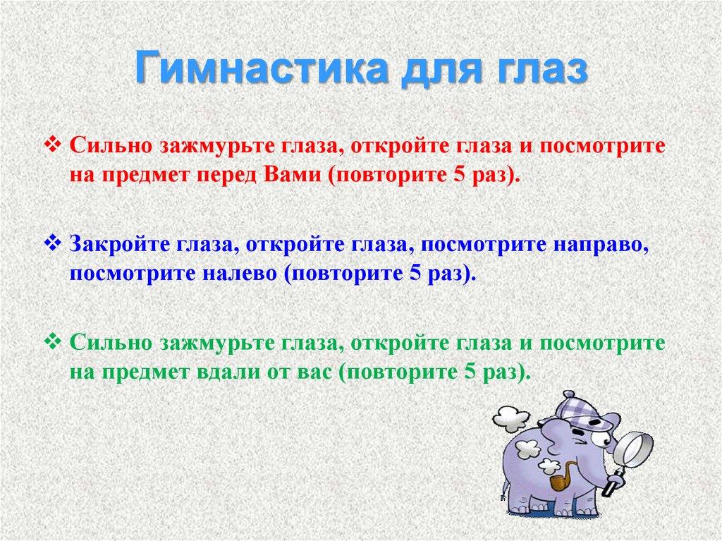 Гимнастика для глазСильно зажмурьте глаза, откройте глаза и посмотрите