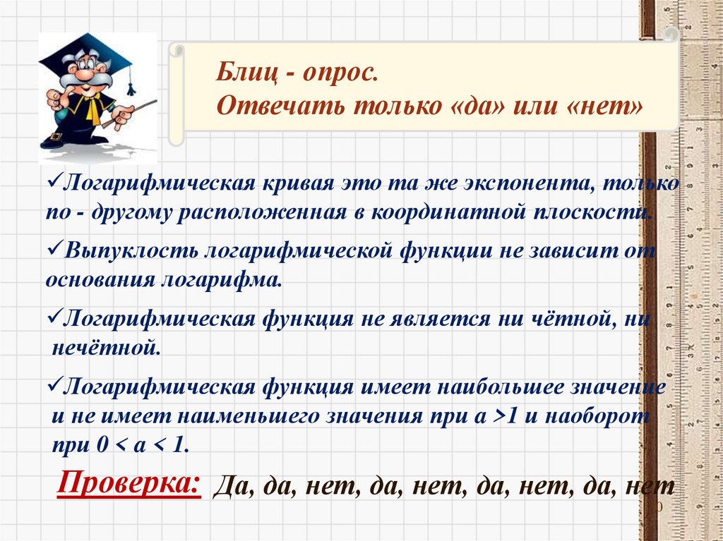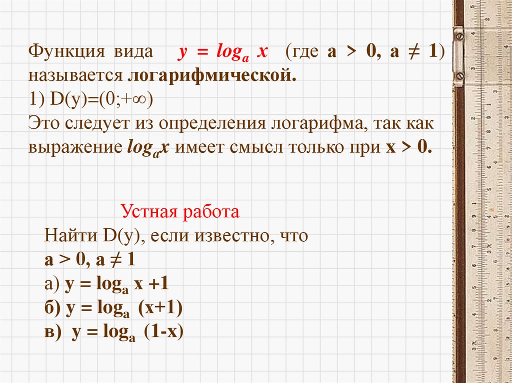 Функция вида y = loga х (где а > 0, а ≠ 1)называется логарифмической.