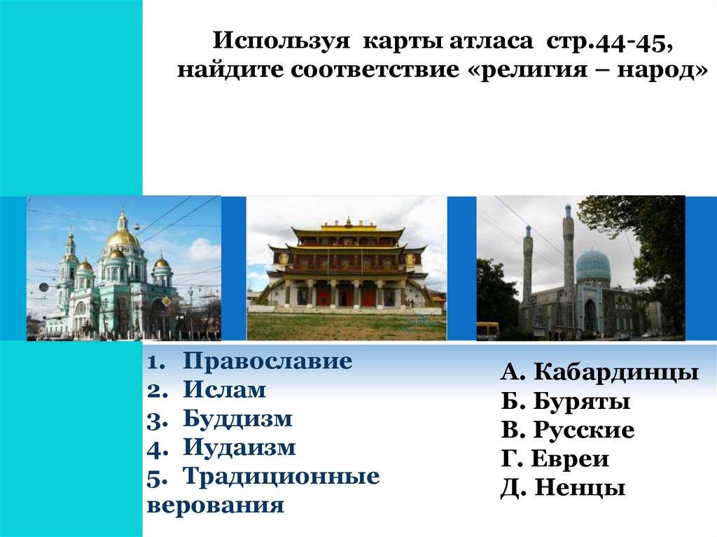 Используя карты атласа стр.44-45,найдите соответствие «религия – народ»