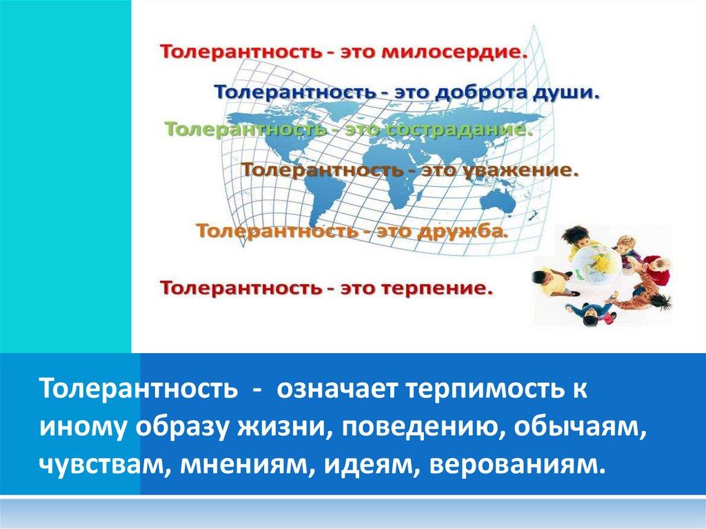 Толерантность - означает терпимость киному образу жизни, поведению, обычаям,