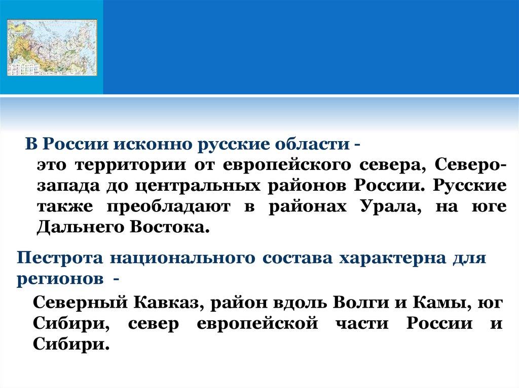 В России исконно русские области это территории от европейского севера, Северозапада до центральных районов России. Русскиетакже преобладают в районах Урала, на юге