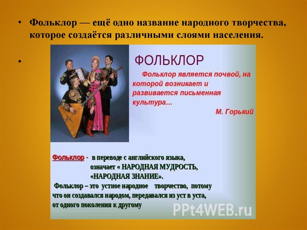 • Фольклор — ещё одно название народного творчества,которое создаётся различными слоями населения.