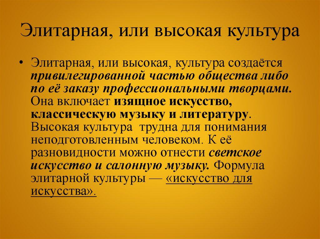 Элитарная, или высокая культура• Элитарная, или высокая, культура создаётся