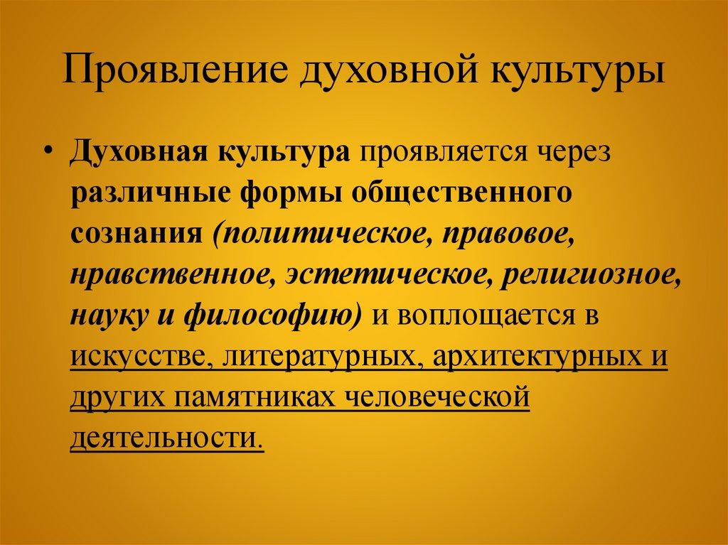 • Духовная культура – сфера человеческойдеятельности, охватывающая различные