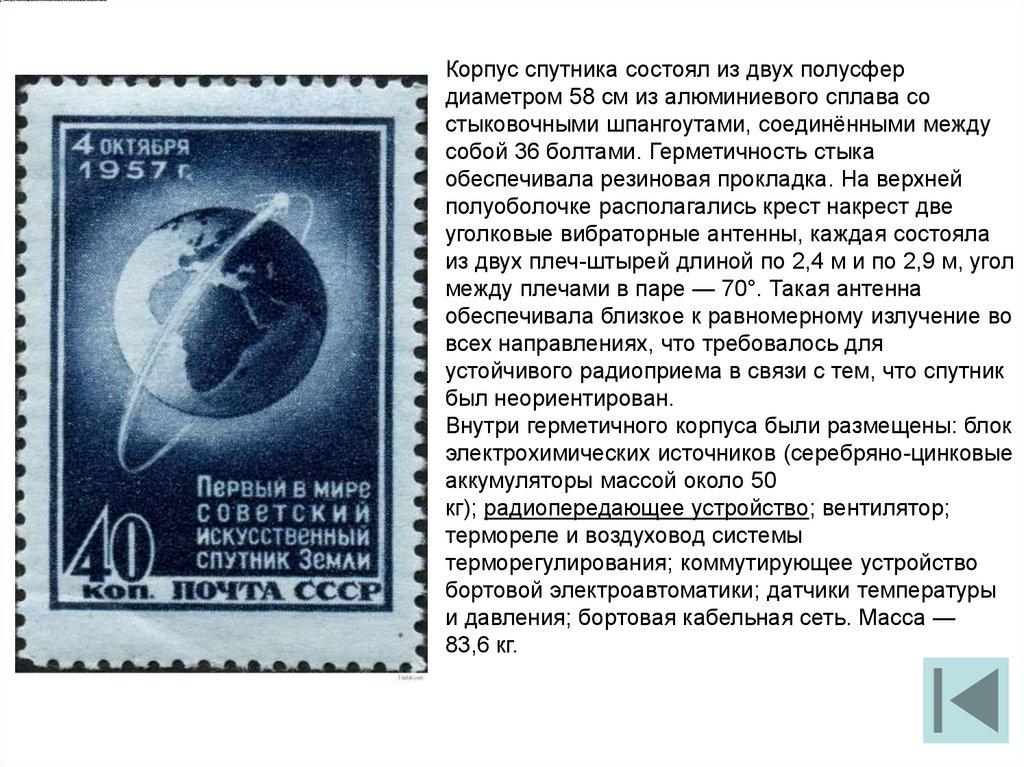 Корпус спутника состоял из двух полусфердиаметром 58 см из алюминиевого сплава со