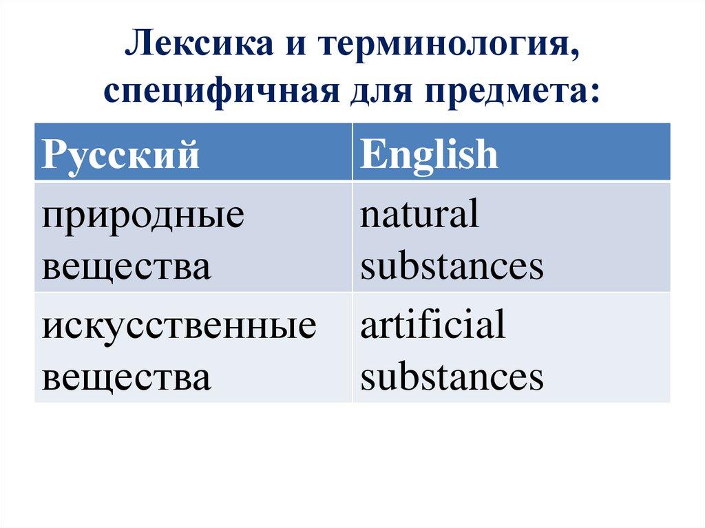 Лексика и терминология,специфичная для предмета: