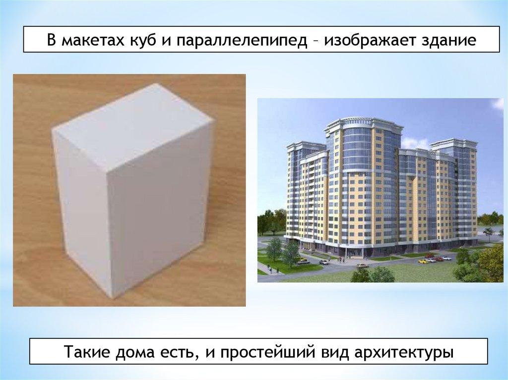 В макетах куб и параллелепипед – изображает зданиеТакие дома есть, и простейший вид архитектуры