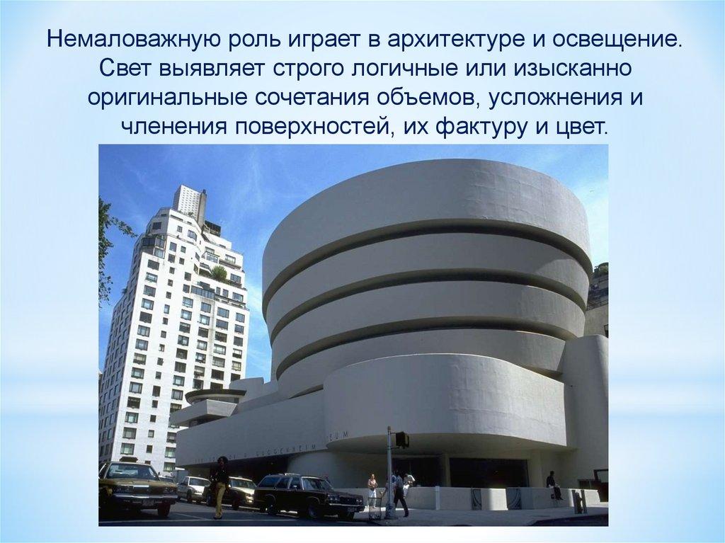 Немаловажную роль играет в архитектуре и освещение.Свет выявляет строго логичные или изысканно