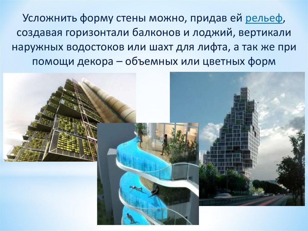 Усложнить форму стены можно, придав ей рельеф,создавая горизонтали балконов и лоджий, вертикали