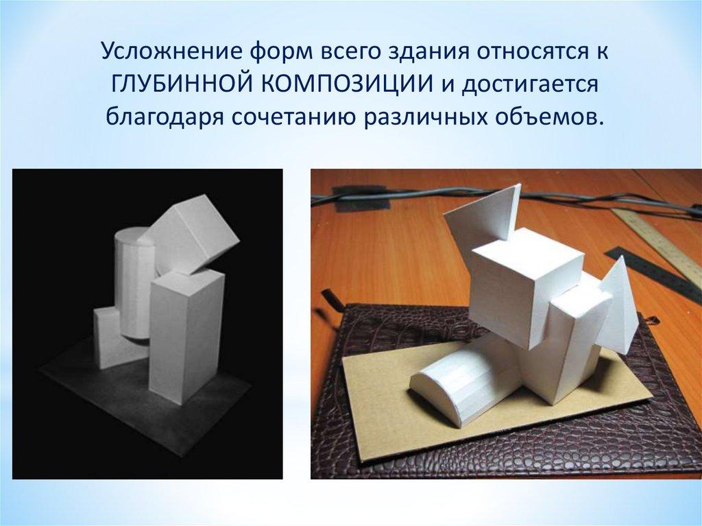 Добиться усложнения формы здания в объемно-глубинной композиции.