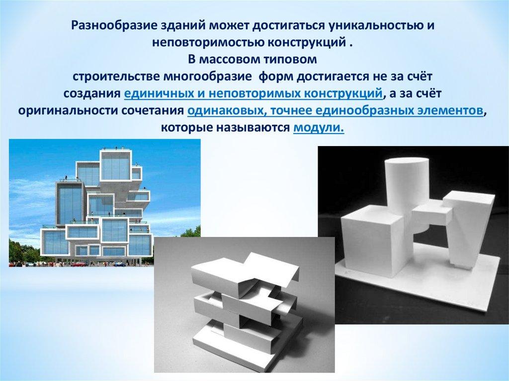 Разнообразие зданий может достигаться уникальностью инеповторимостью конструкций .