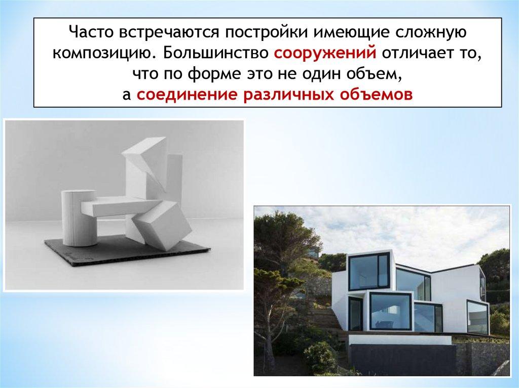 Часто встречаются постройки имеющие сложнуюкомпозицию. Большинство сооружений отличает то,