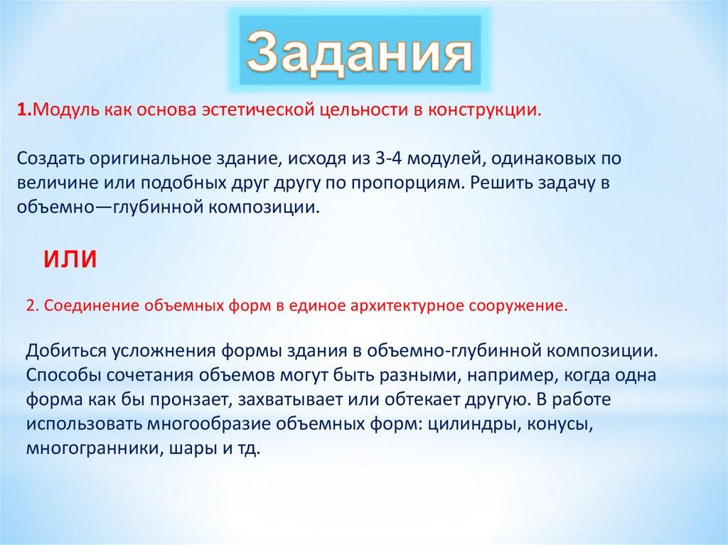 1.Модуль как основа эстетической цельности в конструкции.Создать оригинальное здание, исходя из 3-4 модулей, одинаковых по