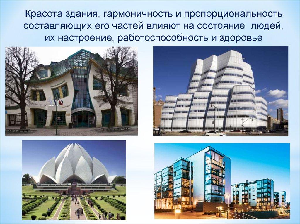 Красота здания, гармоничность и пропорциональностьсоставляющих его частей влияют на состояние людей,