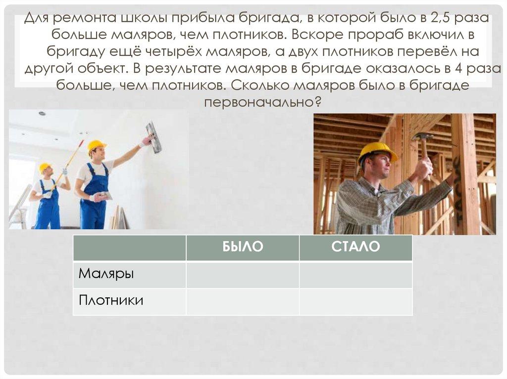 Для ремонта школы прибыла бригада, в которой было в 2,5 разабольше маляров, чем плотников. Вскоре прораб включил в