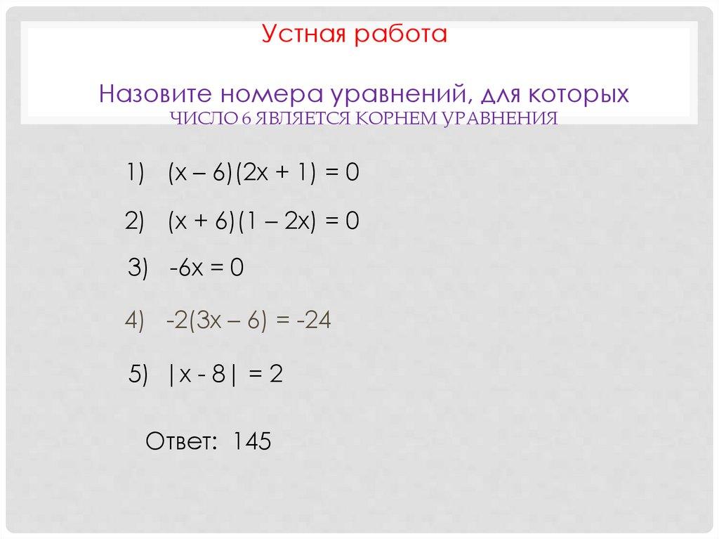ЧИСЛО 6 ЯВЛЯЕТСЯ КОРНЕМ УРАВНЕНИЯ