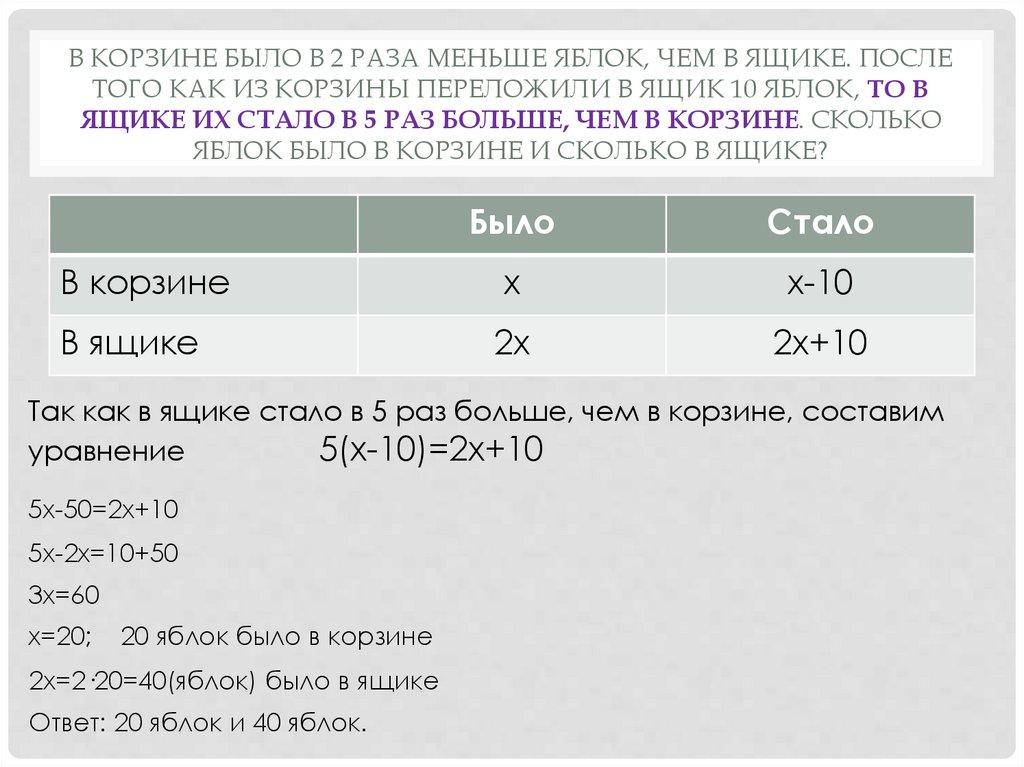 В КОРЗИНЕ БЫЛО В 2 РАЗА МЕНЬШЕ ЯБЛОК, ЧЕМ В ЯЩИКЕ. ПОСЛЕТОГО КАК ИЗ КОРЗИНЫ ПЕРЕЛОЖИЛИ В ЯЩИК 10 ЯБЛОК, ТО В
