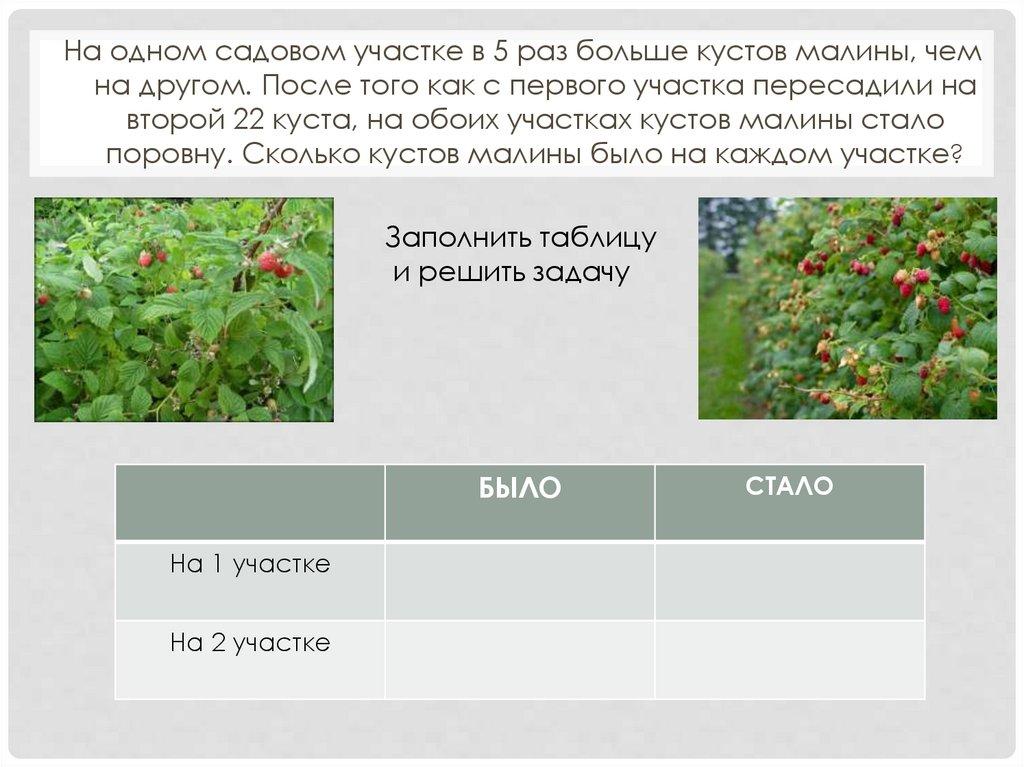 На одном садовом участке в 5 раз больше кустов малины, чемна другом. После того как с первого участка пересадили на