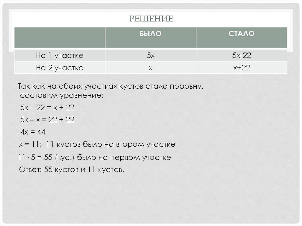 х = 11; 11 кустов было на втором участке