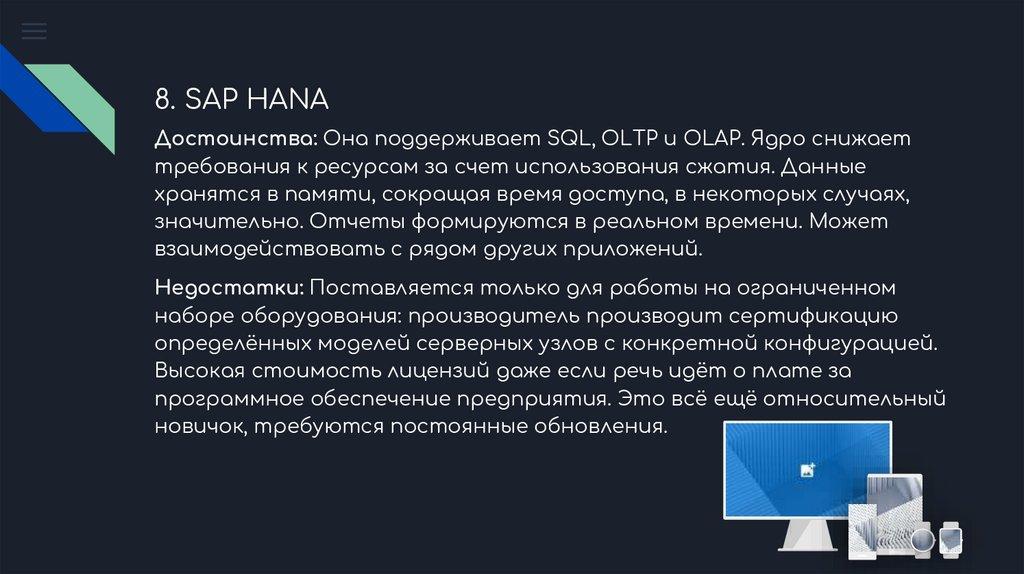 8. SAP HANAДостоинства: Она поддерживает SQL, OLTP и OLAP. Ядро снижает
