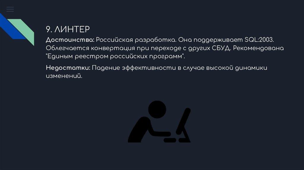 9. ЛИНТЕРДостоинства: Российская разработка. Она поддерживает SQL:2003.