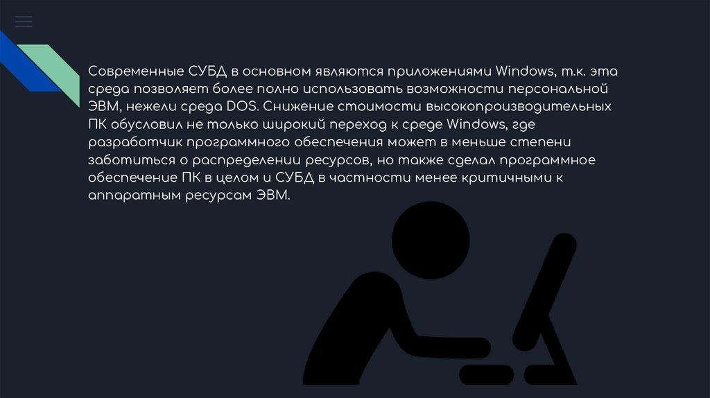 Современные СУБД в основном являются приложениями Windows, т.к. этасреда позволяет более полно использовать возможности персональной