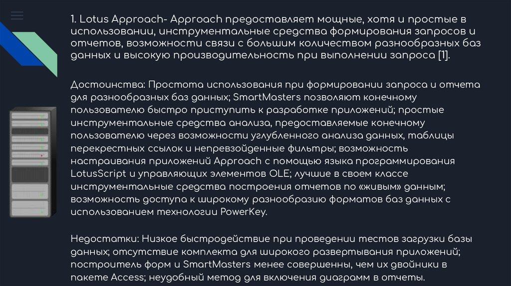1. Lotus Approach- Approach предоставляет мощные, хотя и простые виспользовании, инструментальные средства формирования запросов и